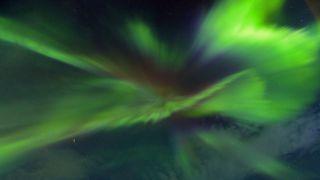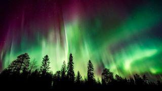 Your view will also depend on where you are standing. For instance, if you are quite some way from the display, it will appear as an arc of green often known as a 'forest fire' (pictured below). When it's closer you'll see a dynamic display, such as rippling green curtains, called 'drapery' aurora. If you're immediately underneath the display, it will all happen above your head, and you may see a 'corona' aurora.