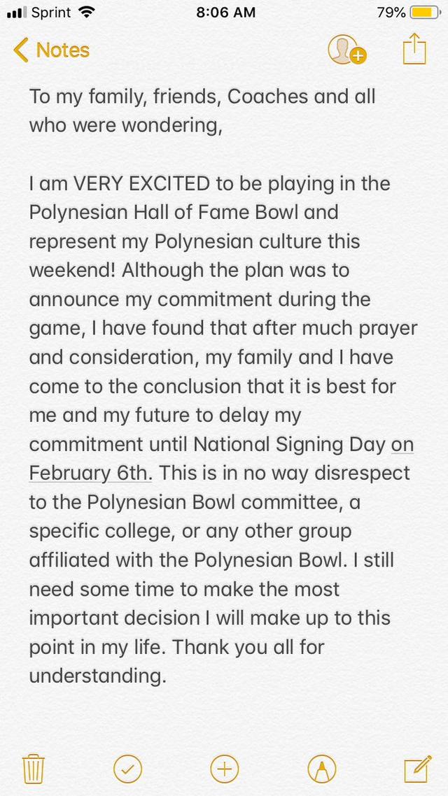 - Four-star OL prospect Enokk Vimahi was previously scheduled to announce his commitment at the Polynesian Bowl, but he now says he’ll commit on National Signing Day. Vimahi officially visited Oklahoma this past weekend.