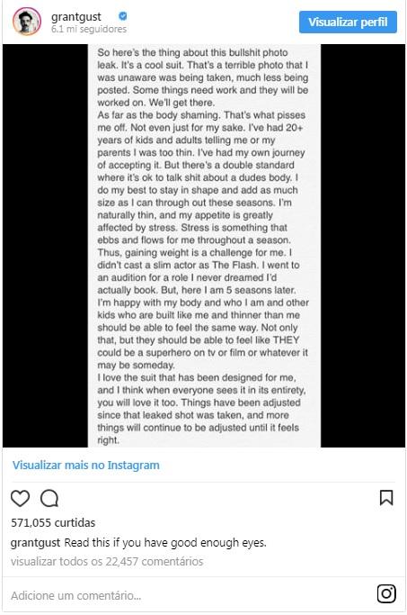 No Instagram, Grant explicou que o uniforme é legal, mas ainda não está finalizado. O ator garante que, quando "The Flash" voltar, todos vão ver como a roupa é diferente da foto, que não deveria ter sido tirada ou postada. Na nota, o rei das selfies no espelhoainda desabafou sobre como as brincadeiras com o seu corpo magro o irritaram. Leia o post na íntegra e traduzido logo abaixo!