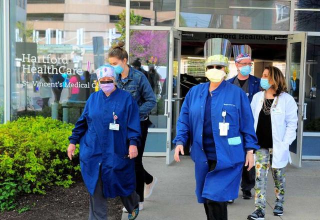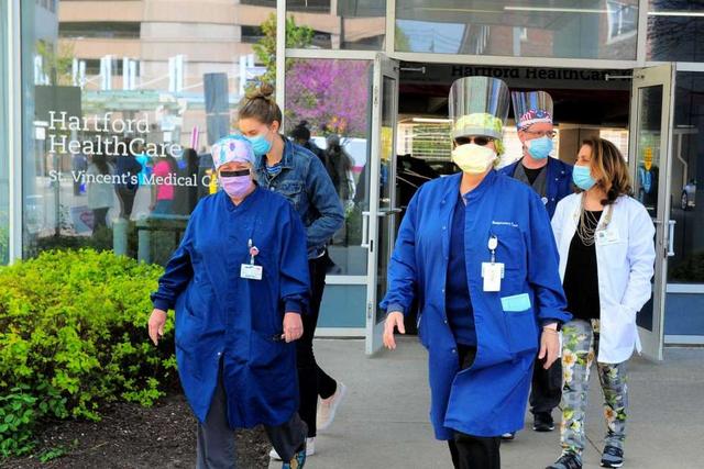 St. Vincent's health care workers were treated to a flyover salute by the the Connecticut National Guard in Bridgeport, Conn., on Thursday May 14, 2020. The cargo plane flew past several hospitals all over the area, including Danbury, Greenwich, Stamford Norwalk and New Haven.
