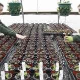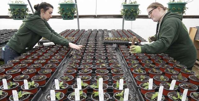 Winterberry Gardens employees keep their distance in late March 2020 at a greenhouse in Southington, Conn.