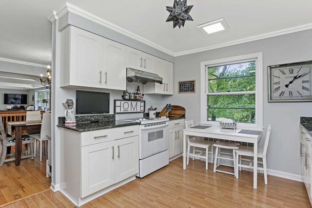 The 2,360-square-foot green house with white shutters features eight rooms on two levels. The house was built in 1963 but has undergone updates. More recently this house was freshly painted, hardwood floors were redone, and a new heating system was installed. The kitchen has been remodeled and the three full bathrooms have been updated.
