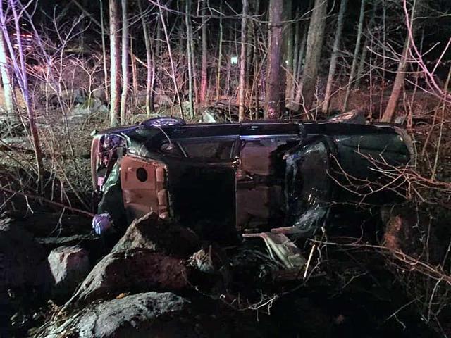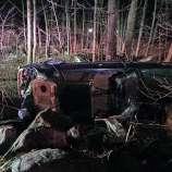 A rollover crash on Hattertown Road in Monroe, Conn., on Thursday, Feb. 13, 2020.