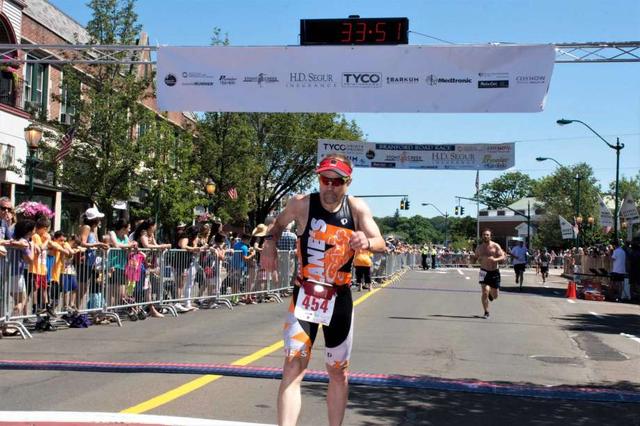 Branford's Alan Mcdougall, pictured here crossing the finish line at the Branford Road Race, is adjusting to competing in virtual road races. The Branford Road Race, held each Father's Day since 1979, will be virtual this year.