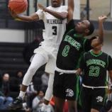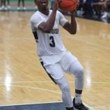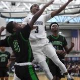 Notre Dame is the No. 1 team in the state and one of the best dressed on the court. For their road unis, the Lancers go with navy jerseys with gold shoulders and neckline. Across the chest is “NOTRE DAME” in navy, outlined in gold. On the back is “LANCERS” under the numbers, also in navy, outlined in gold. The navy shorts have gold around the legs and up the sides. On the bottom of the sides is the Lancer mascot logo.