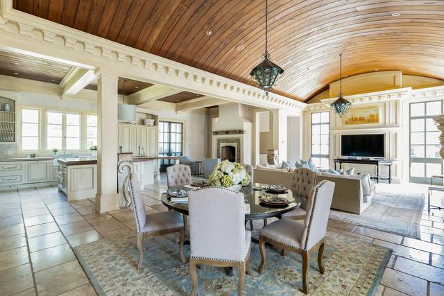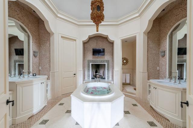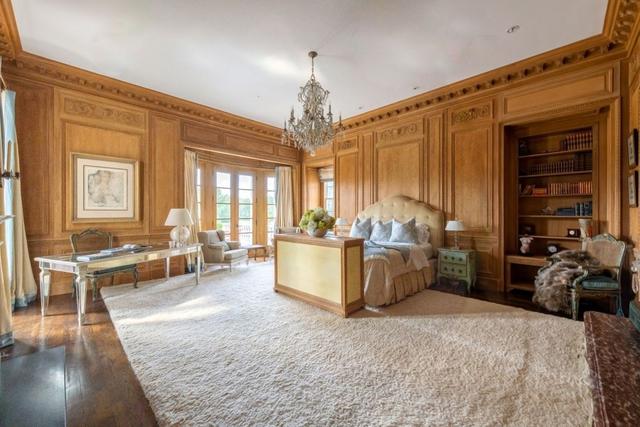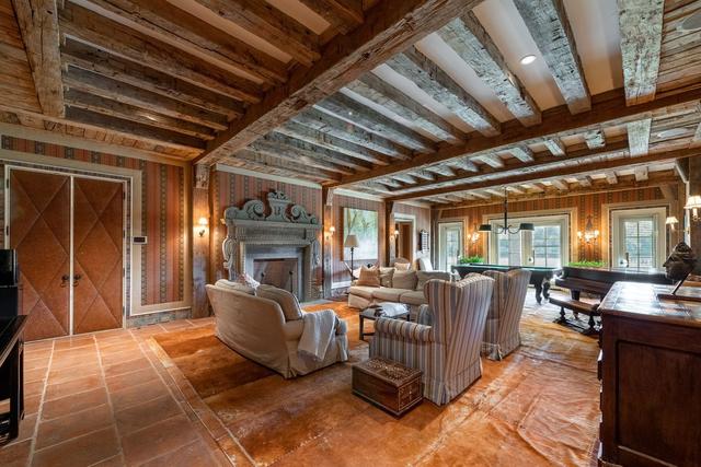 Interesting features include the elevator that services all levels, a kitchen compound so huge it has two fireplaces, the two big garages with suites above them, a sprawling wine cellar and home gym, and one fittingly medieval outdoor playhouse for the kiddos.