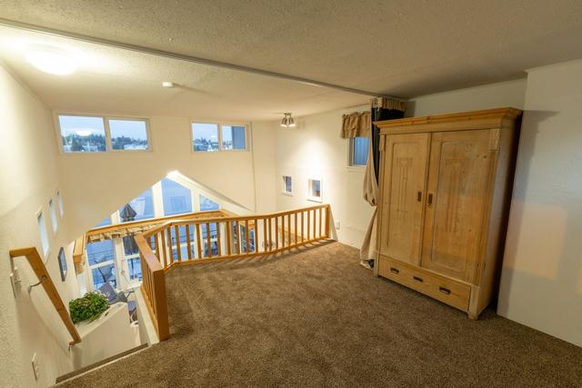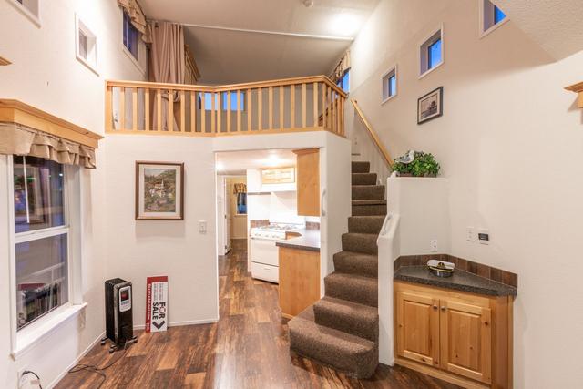 The main gathering space sits under a cathedral ceiling, behind a tall wall of windows that’d be at home looking over a bluff or mountain. A loft looks over the area, catching that same light, with a curtain for privacy.