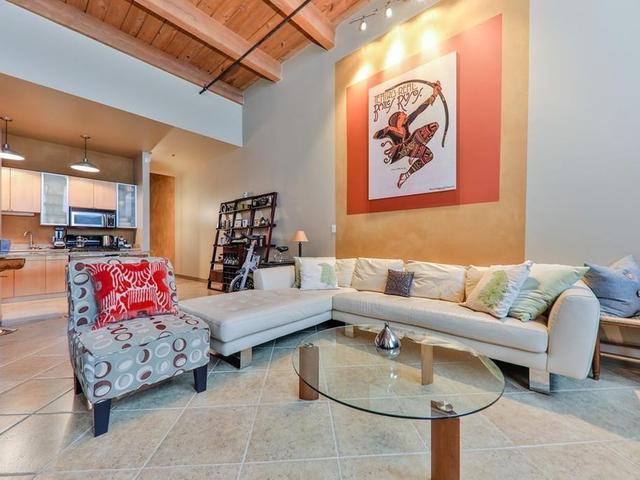 The one-bedroom, one-bathroom has 13-foot ceilings made from trussed oak that’s at least a century old. The setup makes for one airy home.