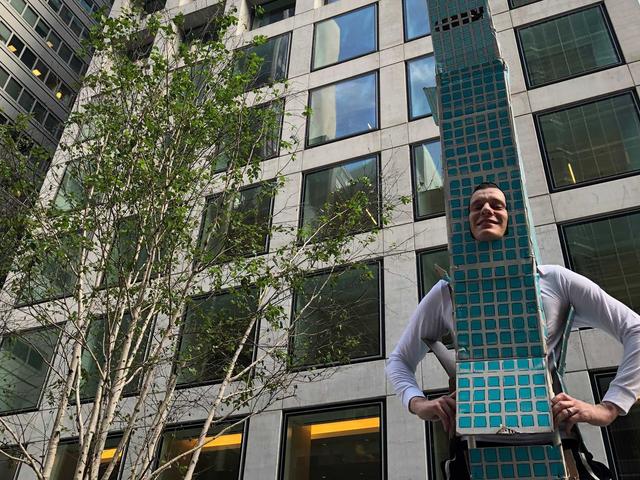 This morning, Littlefield and his wife, Sherri, a photographer and art dealer, did a brief photoshoot in front of the supertall itself, and got the attention of folks within the building. “At first I think people were a little wary, but as I started to put it on I could see they were starting to smile and laugh,” he says—and that’s the point. “I wanted it to look extra-ridiculous and funny.”