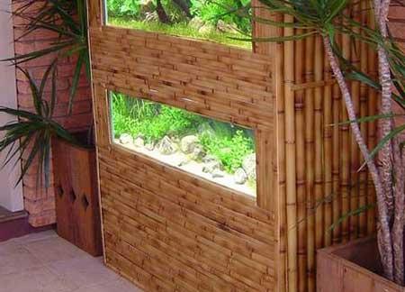 Suporte para jardim de inverno interno – há quem deixe as plantas crescerem à vontade ou as prenda em um suporte, e este pode ser feito em bambu para permitir o crescimento ordenado de trepadeiras e plantas aéreas. O bambu sem pintura, em sua cor marrom original, deixa o ambiente com uma decoração rústica muito especial. Ótima dica para casas de campo também.
