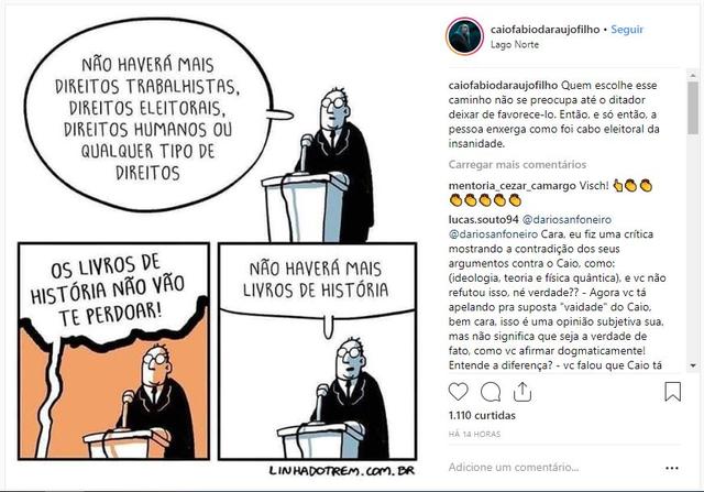 Na última publicação em seu instagram, o ex-pastor presbiteriano, que ainda goza de uma certa influência para não muitos seguidores, voltou a atacar os que demonstram apoiar o candidato Bolsonaro. Em uma charge (figura abaixo), Caio compara, indiretamente, os eleitores de Bolsonaro a “cabos eleitorais da insanidade”.