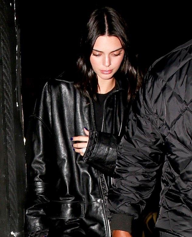 For her night out with her pals, Kendall wore an oversized black leather jacket atop a black minidress.