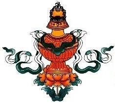 The urn closely resembles the round-bellied, slim-necked Kalash of Hinduism. A large jewel on top gives the urn its other name, the Vase of Treasure. The urn is symbolic of limitless wealth.