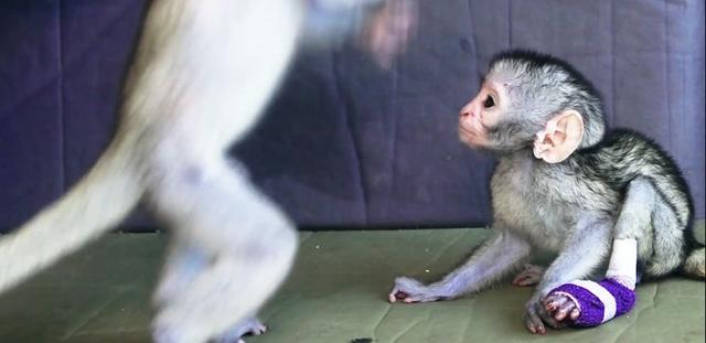 So, what was next for sweet Jerry? Well, when they first put her in with the other monkeys, her foot was in the bandage. She wasn’t able to keep up with them while they played around her, and she didn’t quite understand why.