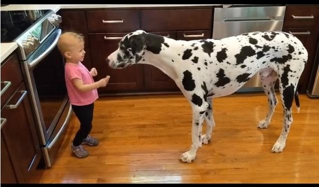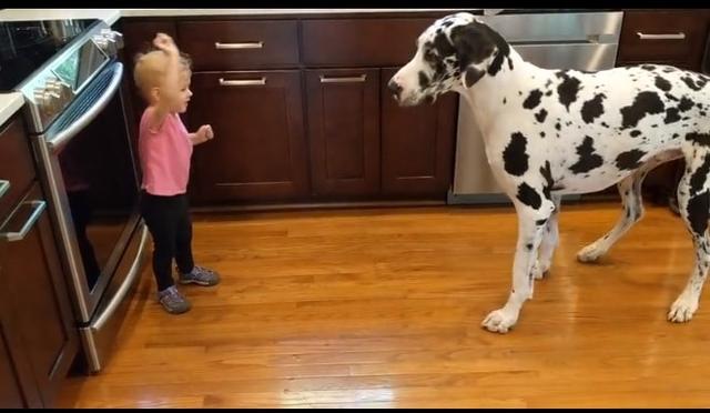 This adorable toddler is teaching her gentle giant, a glorious Great Dane, how to sit. There is only one little problem. However, the doggo doesn’t speak baby.