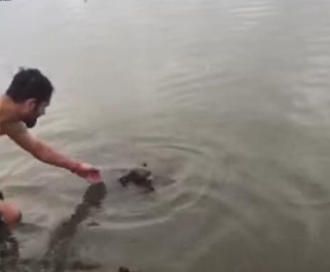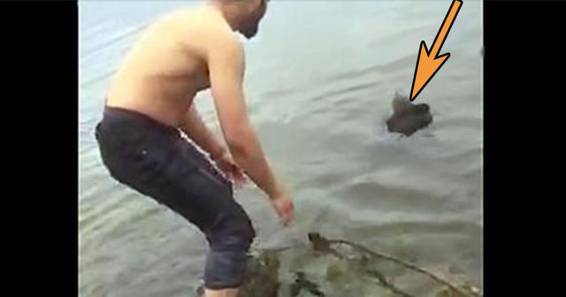 The boys continued to encourage their furry friend to keep paddling back to shore. One of them even made splashes in the water to help guide him to land.