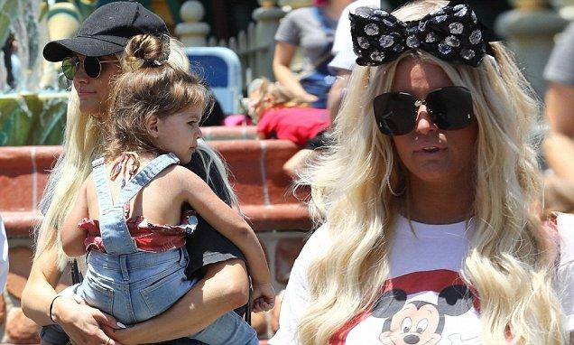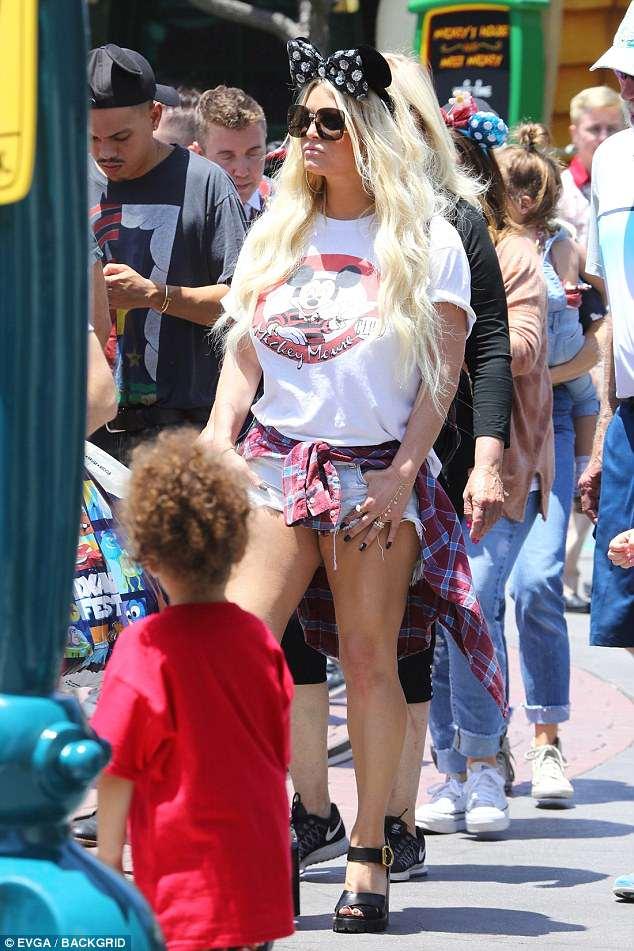 Jessica, 35, whose husband Eric Johnson also joined the outing, teamed her torn Daisy Dukes with a festival of Disney merchandise.