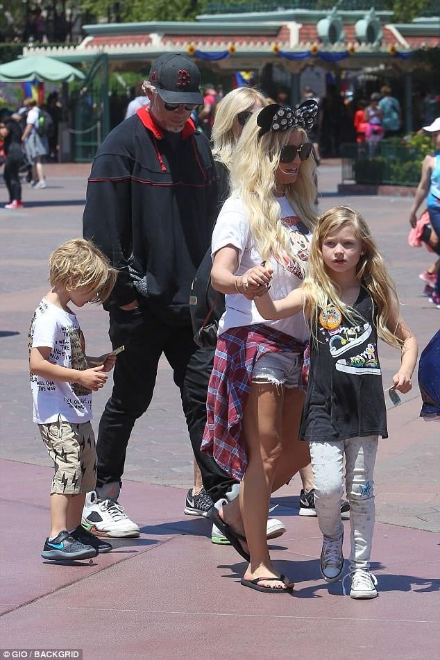 With their brood: Jessica, 35, whose husband Eric Johnson also joined the outing, teamed her torn Daisy Dukes with a festival of Disney merchandise