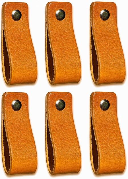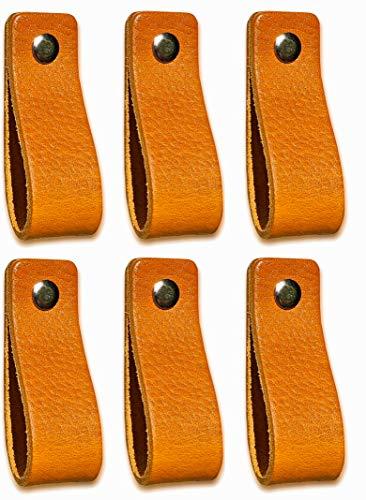 Tiradores de Cuero | Amarillo Ocre / 6 piezas | 16,5 x 2,5 cm | Piel de Granos | 3 tornillos de color - tiradores para Accesorio de Mobilario, armario, cajón, puerta