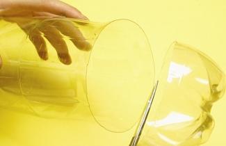Marque um ponto na marca de 9 cm a partir do gargalo e faça de novo a operação: perfure com o estilete e com a tesoura corte o anel superior.