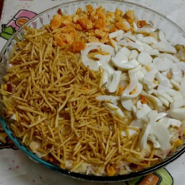 Em uma travessa, faça uma camada de arroz, seguida de uma camada de presunto e uma camada de mussarela.