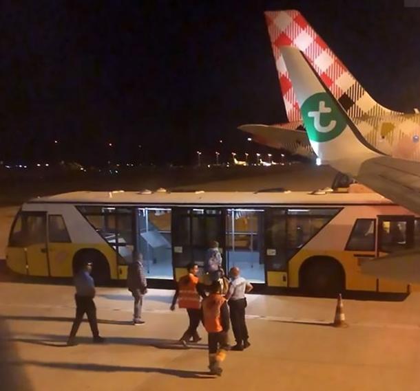 Photo shows the man being escorted off the plane by medical staff and placed on an airport bus.