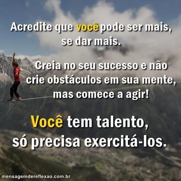 Muitas vezes perdemos oportunidades por não acreditarmos que podemos ir mais longe, como quando as coisas não saem de acordo com o esperado, ou quando seu tempo foge entre suas mãos e nada dá certo. E agora, o que fazer? Agora é o momento de agir. Desafie a si mesma e faça do tempo o seu aliado, coloque para fora as suas qualidades e use suas habilidades, assim você pode fazer a diferença nesse exato momento. Acredite que você pode ser mais, se dar mais. Creia no seu sucesso e não crie obstáculos em sua mente, mas comece a agir! Você tem talento, só precisa exercitá-los.