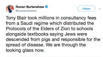 Also, Blair has been fabulously remunerated by Saudi Arabia for working as a consultant to the head-chopping regime, one that has funded a militant Islamic extremism across the Middle East, destabilising the region and contributing to countless more deaths.