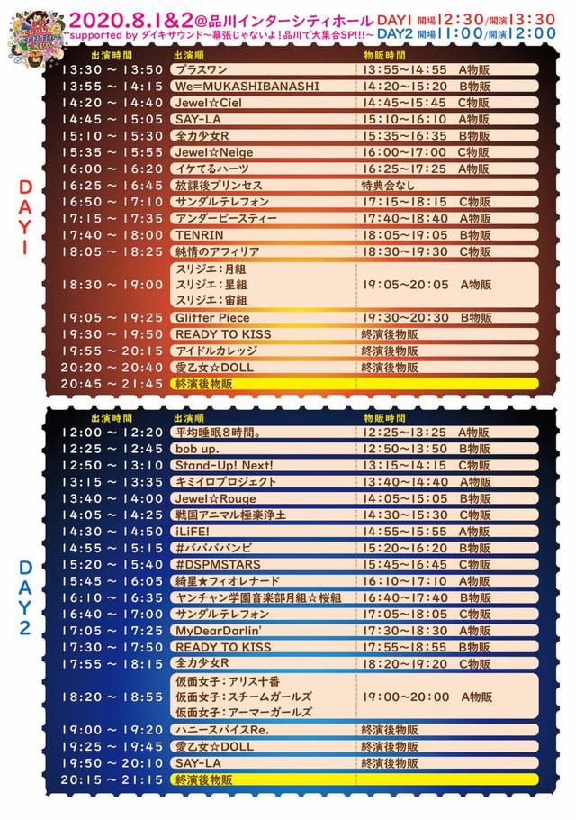 <出演> DAY1:アイドルカレッジ / アンダービースティー / イケてるハーツ / We=MUKASHIBANASHI / Glitter Piece / サンダルテレフォン / Jewel☆Ciel / Jewel☆Neige / 純情のアフィリア / スリジエ:月組 / スリジエ:星組 / スリジエ:宙組 / SAY-LA / 全力少女R / TENRIN / プラスワン / 放課後プリンセス / 愛乙女☆DOLL / READY TO KISS (五十音順)