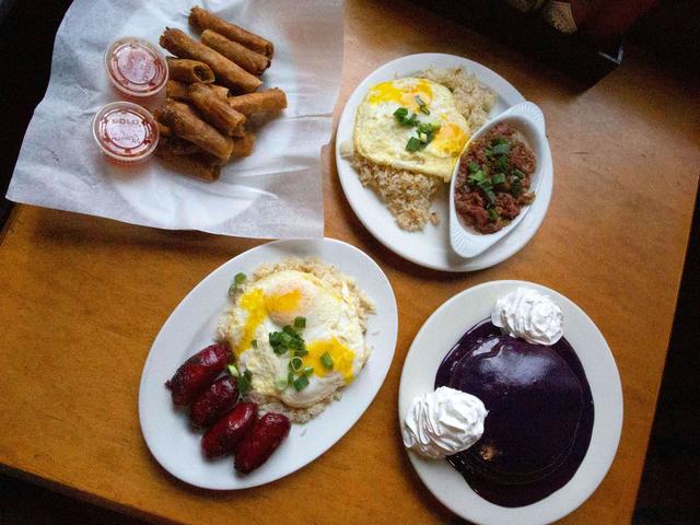 Ube pancakes, corned beef silog, longsilog, and lumpia. | Esra Erol for Eater
