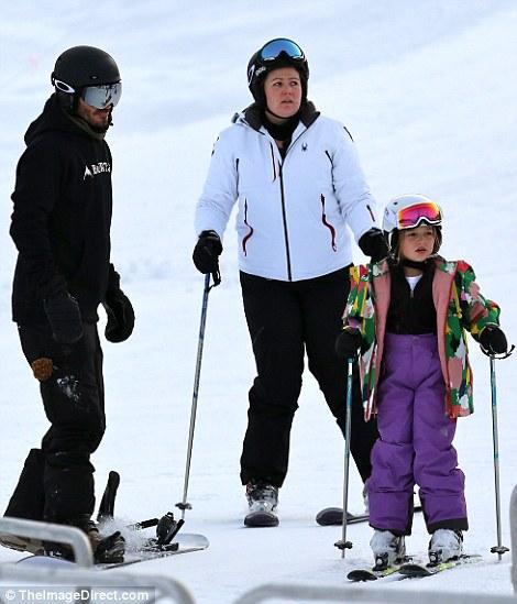 And they're off: While Harper mastered her ski skills, former footballer David and son Cruz chose to snowboard instead - cutting effortlessly cool figures as they raced each other to the bottom