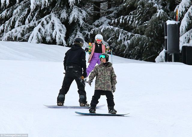Here we go!Adding a white helmet and vibrant pink-tinted goggles, Harper appeared ready and raring to go as she joined her dad and brother (pictured right) for a busy day of skiing