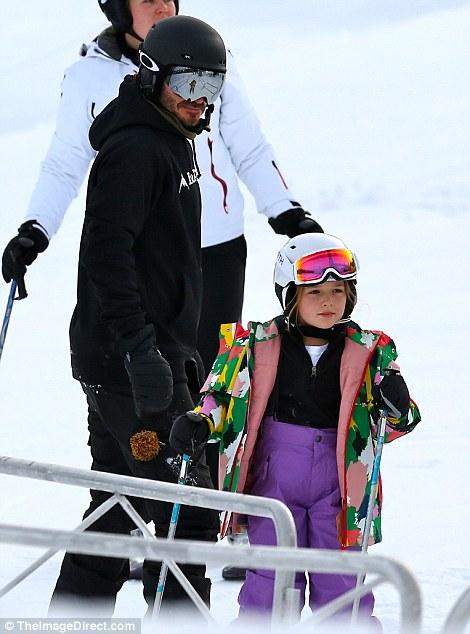The Beckhams' only daughter proved to be a mini fashionista as she hit the slopes in bright purple trousers and a clashing printed jacket, of pink yellow and green.