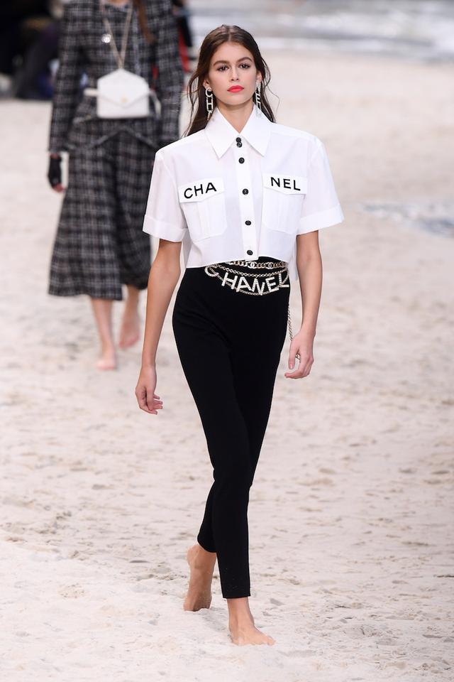 Al igual que en temporadas pasadas, Kaia Gerber se robó el show. La modelo lució una camisa con botones que en la parte de las bolsas tenía grabada la palabra Chanel, complementó su look con pantalones negros, pendientes XL y un cinturón.