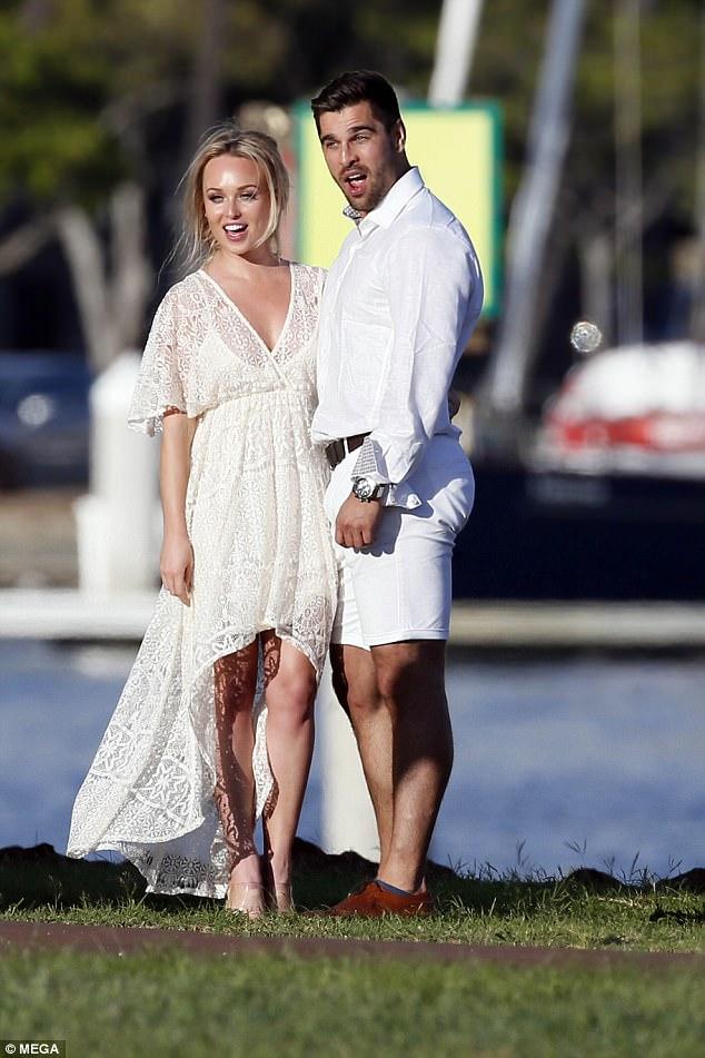 The former Hollyoaks star rocked a tropical print one-piece, which flashed her peachy posterior with its thong cut, as she shared a tight hug with the hunk.