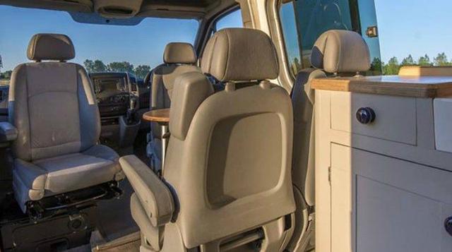 Plus, this first row of swivel captain chairs double as car seats and dining room chairs. They face forward when on the road, and pivot backwards during meal time, creating a makeshift dining room set-up.