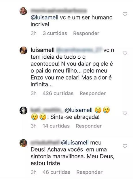 Logo após, ela volta a responder outra fã e diz: "Você não tem ideia de tudo o que aconteceu! Não vou falar porque ele é pai do meu filho. Pelo meu Enzo vou me calar! Mas a dor é infinita", finaliza.