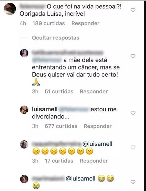 Na conversa, a ativista é questionada por uma seguidora sobre o que teria acontecido em sua vida pessoal. Luisa responde que está se divorciando.