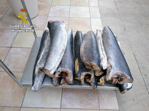 Los guardias civiles realizaron varias inspecciónes en dos embarcaciones profesionales de pesca y se incautaron de un total de 12 piezas de pez espada con la cabeza y cola cortada, de talla inferior a la comercializable, cuyo peso total ascendía a un total de 50,38 kilogramos.