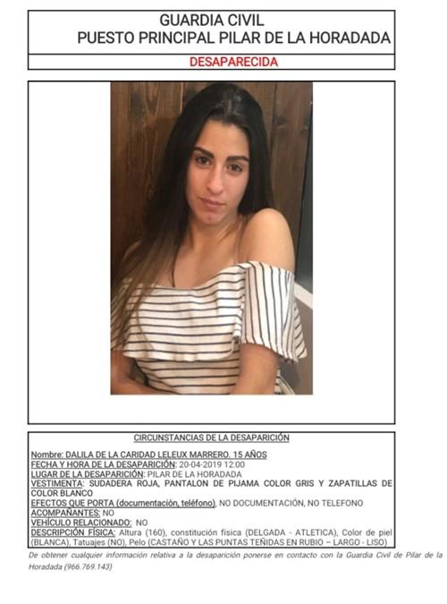 Dalila, la joven de 15 años que desapareció este sábado en el municipio alicantino de Pilar de la Horadada, ha sido localizada en buen estado según ha informado la Asociación SOS Desaparecidos en su cuenta de Twitter.