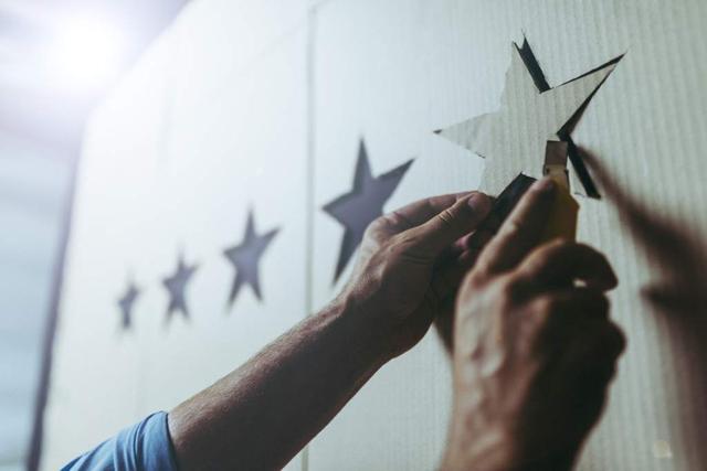 Businessman using a yellow cutter to cut five stars from a cardboard box. Customer satisfaction and best rating concept.