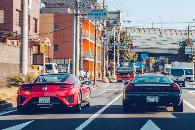 The new NSX’s long gestation and numerous show appearances mean it’s a familiar shape now, but on a crisp late- October morning in Tokyo the NSX cuts a striking form. That might be down to the Valencia Red Pearl paintwork, or it might be the small oblong Japanese number- plate up front, which photographer Mark Riccioni has already noted improves the look of everything from the humble Honda Jazz to the evo-kryptonite Prius.