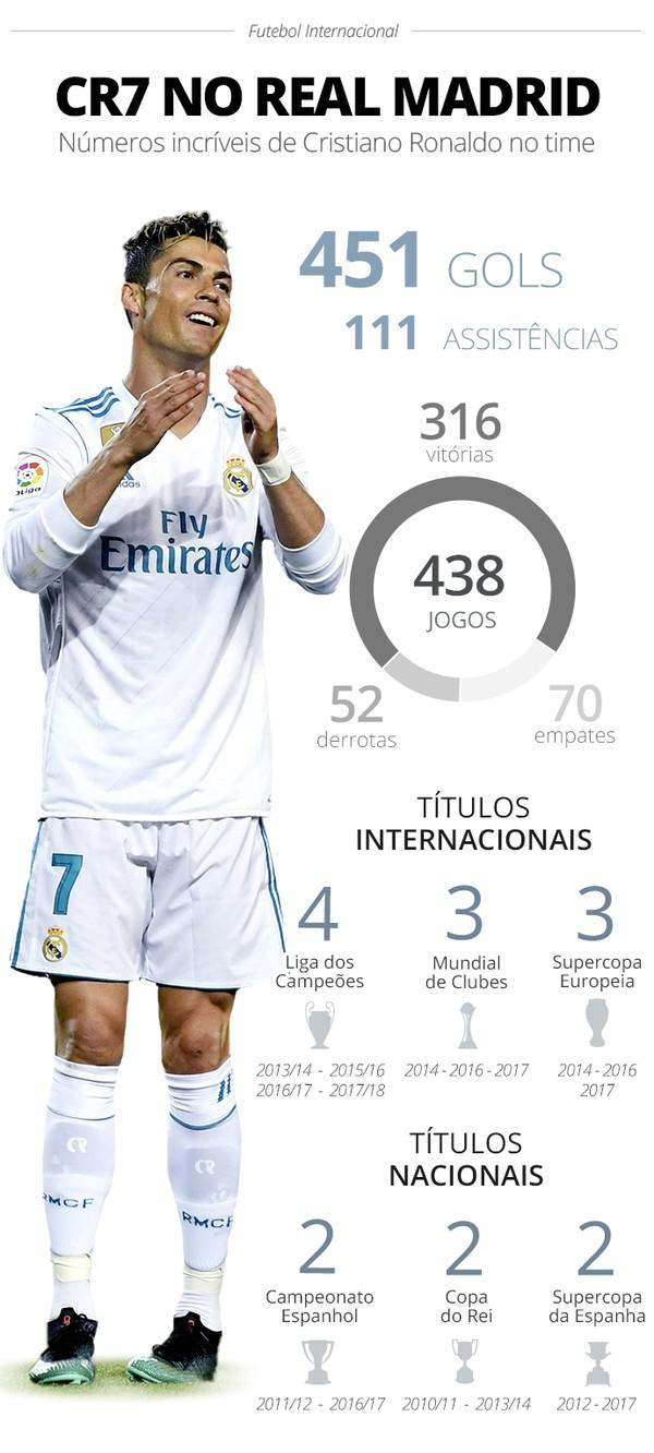 Foi um casamento de exatos nove anos, desde a apresentação em Madri ao anúncio da Juventus. Durante os 3.291 dias em que Cristiano Ronaldo defendeu a camisa do Real Madrid, o craque ajudou o clube a reconquistar a Europa, com quatro títulos de Liga dos Campeões. Ainda se tornou o maior artilheiro da história do clube, com 450 gols em 438 jogos: média de 1,02 gols por partida.