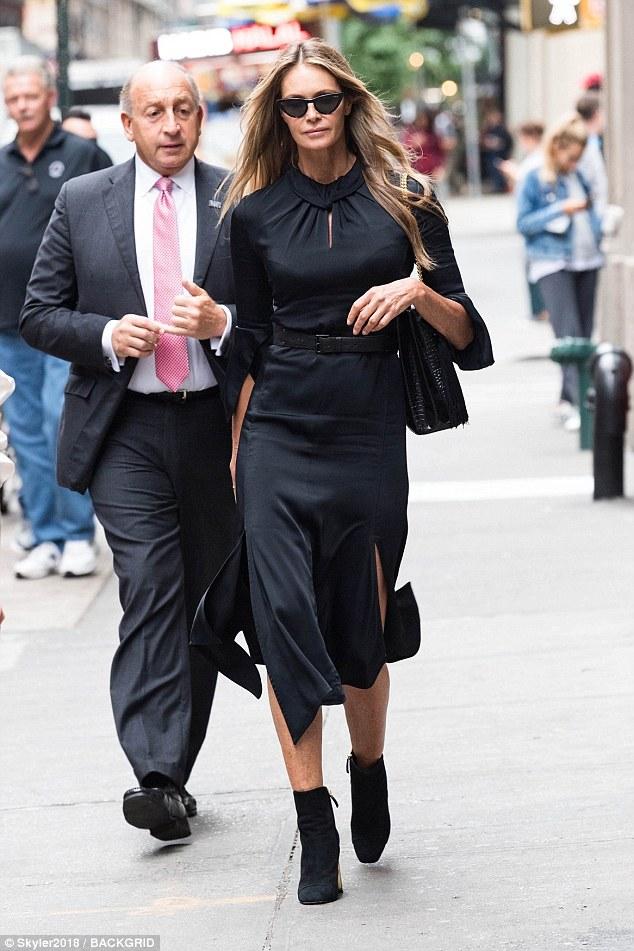 Elle Macpherson stunned in a belted black dress and suede booties as she sauntered down the streets of NYC on Thursday.