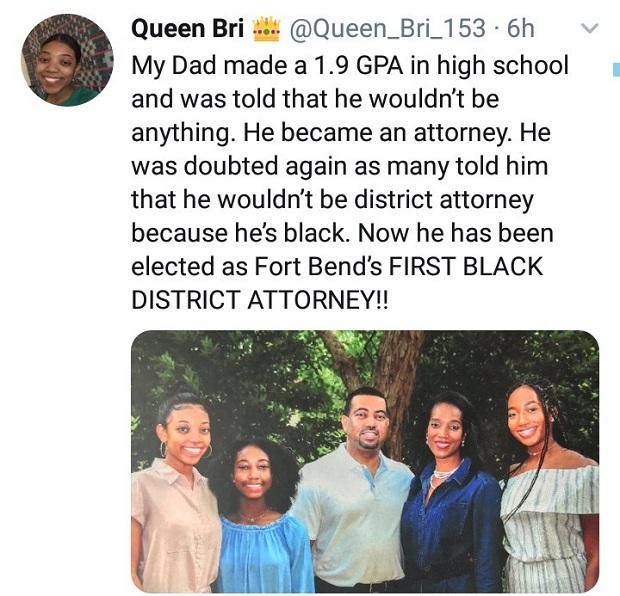 According the user on the handle ‘Queen Bri’, her father made 1.9 GPA in High School and was told he wouldn’t amount to anything but he went ahead to become an attorney. The man further surged ahead to become the first black District Attorney of Fort Bend.