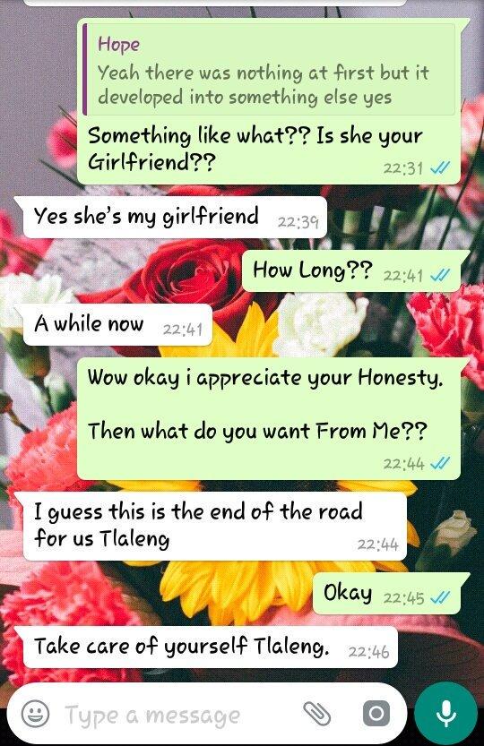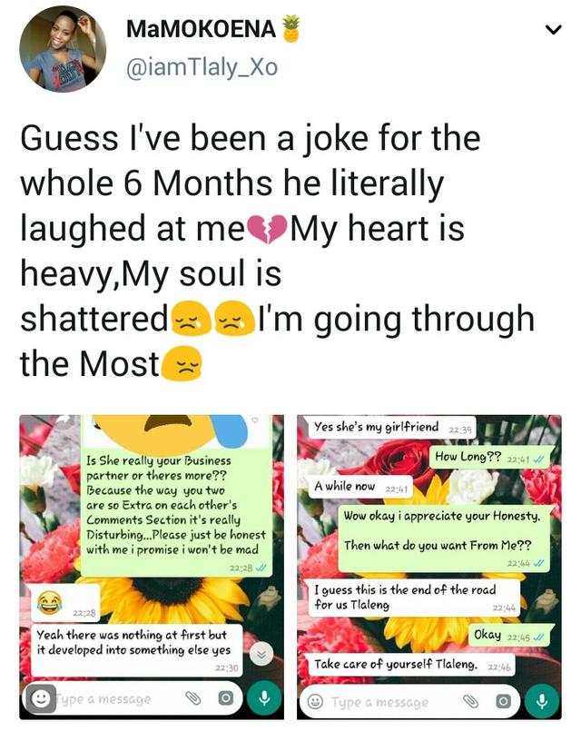The hurting lady on the Twitter handle ‘MaMOKOENA’ shared screenshots of the conversation she had with her man in which he confirmed her fears.