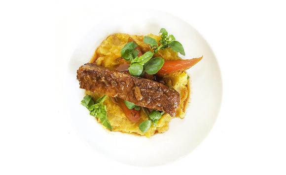 Sirva num prato fundo colocando primeiro a polenta e por cima a costelinha, o mamão e o agrião.
