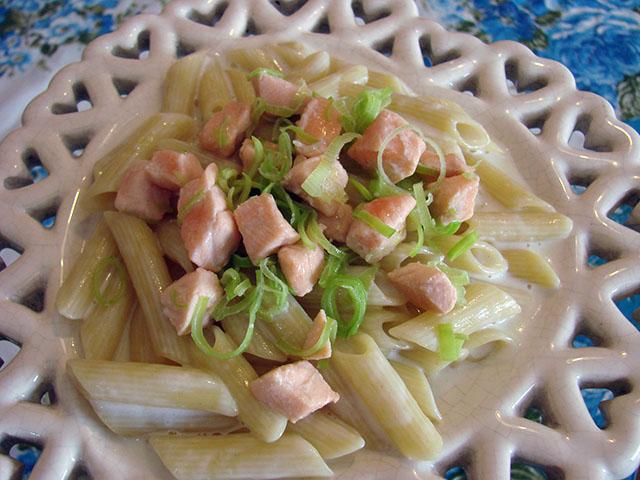 - Com o molho e o penne prontos, prepare o salmão e o alho-poró: em uma frigideira no fogo baixo, derreta 1 colher de margarina e frite o alho-poró, colocando em seguida os cubinhos de salmão pra dar apenas uma selada.