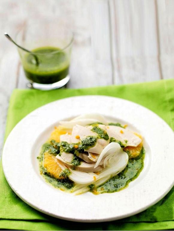 Lave a salsinha, retire os talos e pique finamente. Em uma panela, adicione muita água, uma pitada de sal, a folha de louro e o peito de frango. Cozinhe por cerca de 20/30 minutos, depois escorra, mas salva o caldo. Despeje em um liquidificador a salsa picada, as alcaparras, o dente de alho, azeite, uma pitada de sal e uma colher de sopa de caldo de galinha. Misture até formar um creme homogêneo. Agora corte o frango em fatias finas, a laranja descascada em gomos, também removendo também a película. Limpe a erva-doce e também corte em fatias finas. Disponha em cada prato algumas fatias de frango, adicione alguns gomos de laranja e erva-doce e despeje uma parte do molho preparado.