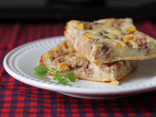 3. Despeje a massa na fôrma e acrescente o recheio sobre a mesma. Eu espalhei delicadamente o atum ralado e fui salpicando o milho com a azeitona, pegando bem as bordinhas.